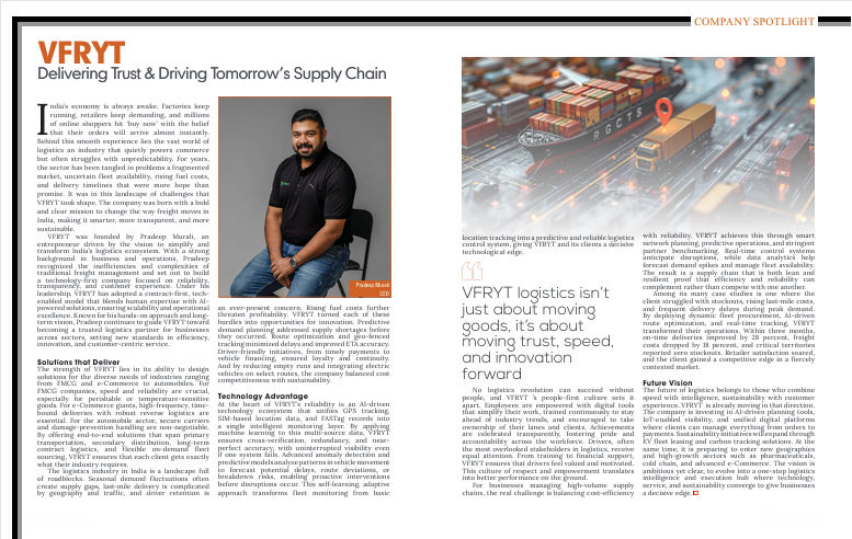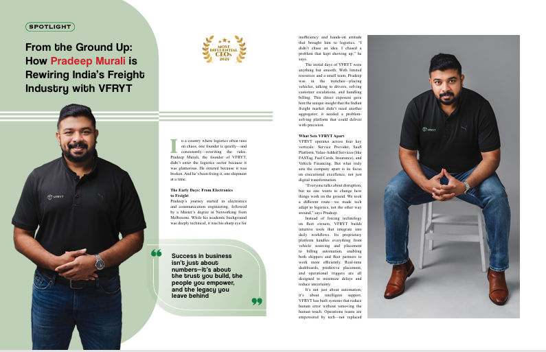 Pradeep Murali is the Founder and CEO of VFRYT, a technology-driven logistics platform focused on simplifying freight movement and improving operational efficiency across the Indian logistics ecosystem.